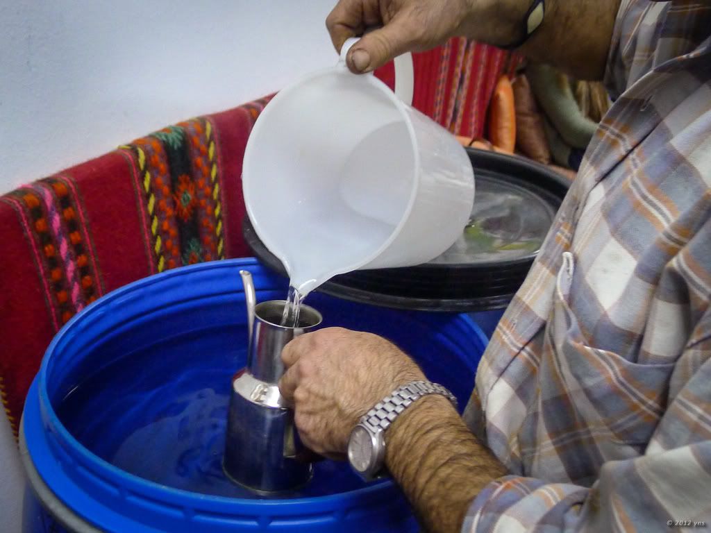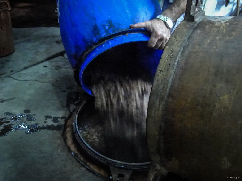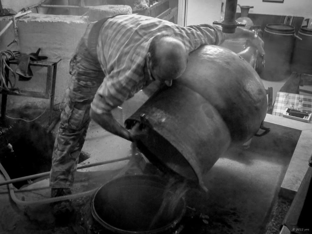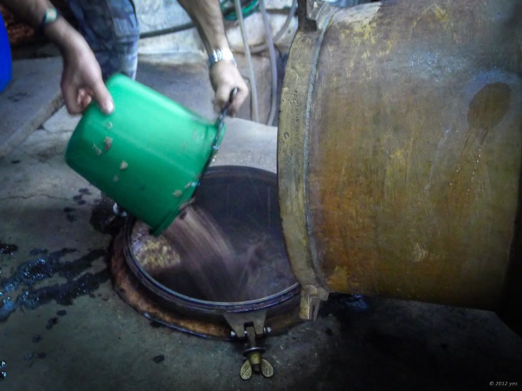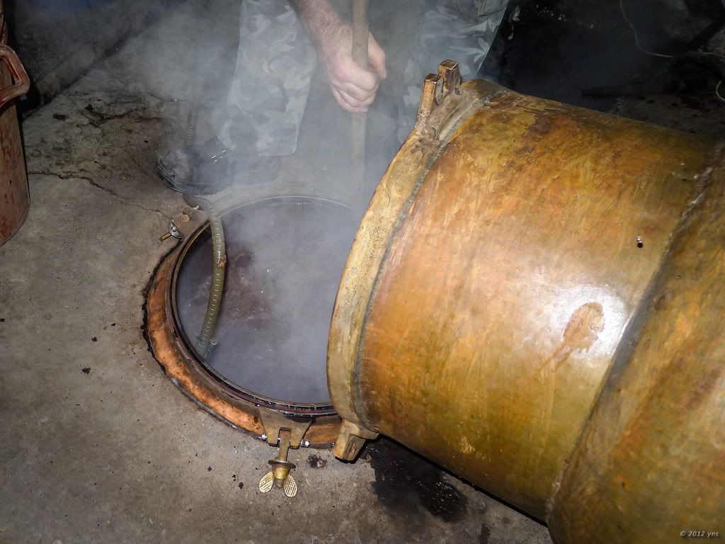 Δανείζομαι από εδώ. "Ως πρώτη ύλη στο ρακοκάζανο μπαίνουν τα τσίκουδα ή στράφυλλα (πολτοποιημένα σταφύλια), απομεινάρια του πατήματος των σταφυλιών για να βγει ο μούστος, τα οποία έχουν μείνει αποθηκευμένα σε μεγάλα βαρέλια για 20-40 ημέρες, οσότου γίνει η ζύμωση. Στη συνέχεια, προστίθεται η κατάλληλη ποσότητα νερού και ανάβεται η φωτιά. Καθώς το καζάνι αρχίζει να βράζει η διαδικασία της απόσταξης γίνεται μπροστά στα μάτια σας! Σε μια ώρα, σταγόνα σταγόνα αρχίζει να ρέει το πρώτο σώμα του αποστάγματος, το πρωτοράκι, πολύ δυνατή ρακή, σκέτο οινόπνευμα! Όσο συνεχίζεται η απόσταξη, η ρακή παίρνει τις σωστές αναλογίες και βαθμούς. Συνήθως το καζάνι «κλείνει» περίπου στους 18 βαθμούς. Η μοσχοβολιστή ρακή, αχνιστή ακόμη, δίνει το σύνθημα για τρικούβερτο γλέντι." Ο Νίκος χρησιμοποιεί πυρήνα ελιάς σαν καύσιμη ύλη. Τα στράφυλλα μπαίνουν στο καζάνι http://i1226.photobucket.com/albums/...i/P1090781.jpg http://i1226.photobucket.com/albums/...i/P1090782.jpg http://i1226.photobucket.com/albums/...i/P1090812.jpg http://i1226.photobucket.com/albums/...i/P1090813.jpg http://i1226.photobucket.com/albums/...i/P1090768.jpg http://i1226.photobucket.com/albums/...i/P1090769.jpg http://i1226.photobucket.com/albums/...i/P1090808.jpg |