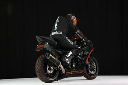 http://www.mototriti.gr/jpg/mtr/thum...S/03120914.jpg …και ενίοτε 280! Φυσικά δεν πρόκειται για κάτι normal, αλλά για το Asphaltfighters Stormbringer ZX-10R που υπόσχεται ως άλλος σαμάνος να προκαλέσει καταιγίδες, θύελλες, σεισμούς και καταποντισμούς με ένα απλό άνοιγμα του γκαζιού! http://www.mototriti.gr/images/TR.gif H Asphaltfighters αποτελεί ένα βελτιωτικό οίκο με ανησυχίες. Προφανώς σε κάποιο meeting τους αποφάσισαν να κατασκευάσουν μια εξωφρενικά γρήγορη street legal μοτοσικλέτα, ιδέα στην οποία είμαστε σίγουροι ότι όλοι συμφώνησαν. Με βάση ένα Kawasaki ZX-10R και χωρίς αύξηση στη χωρητικότητα του κινητήρα που παραμένει στα 999κε.κ., η Asphaltfighters κατάφερε να βγάλει 220 ίππους χωρίς ωστόσο να αναφέρονται οι μετατροπές και το «σκαλίσματα» που έχουν πραγματοποιηθεί. Επειδή όμως τα 220 άλογα δεν ήταν αρκετά, τοποθέτησαν ένα κουμπάκι που αναγράφει πάνω του «booster mode» και με το πάτημα του η απόδοση εκτοξεύεται στους 280 ίππους. Φυσικά η επιλογή αυτή δεν είναι για χόρταση και διαρκεί μόνο για λίγα δευτερόλεπτα (μάλλον για nitro πρόκειται) ωστόσο ο χρόνος αυτός είναι αρκετός για να απαντηθούν τυχόν «ερωτήματα» από αμφισβητίες…Οι χρόνοι του Stormbringer ZX-10R είναι χαρακτηριστικοί…2,8 sec για τα 100 χ.α.ω. δεν είναι κάτι εντυπωσιακό, ωστόσο τα 6,5 sec για τα 200 χ.α.ω. και τα 13,9 sec για τα 300 χ.α.ω. σίγουρα δεν αφήνουν κανένα ασυγκίνητο. Η τελική ταχύτητα της μοτοσικλέτας είναι 320 χλμ./ ώρα και όλα αυτά βέβαια επιτυγχάνονται χωρίς τη χρήση του «κουμπιού» που αναφέρθηκε πιο πάνω! μοτοτριτη ................:) |