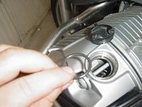 ...ξεβιδώνουμε την τάπα εισαγωγής των λαδιών πανω στο δεξί κύλινδρο .....και σπρώχνουμε ενα δοχειο συλλογής των παλιων λαδιων κατω απ τη μοτοσυκλετα! Στη συνεχεια με ενα 8αρη απλο εξαγωνικό καρυδακι( M16 x 1,5) ή ενα τορξ Τ50 και περίσσια προσοχη (..γιατι τα λαδια ακομα καίνε !) βγαζουμε την ταπα του λαδιου !