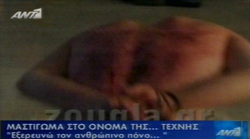 Εικόνες φρίκης εκτυλίχθηκαν στην έκθεση Art Athina 2009 όπου ένας άνθρωπος μαστιγώθηκε δημόσια στο χώρο της έκθεσης απο έναν καλλιτέχνη σε ζωντανή αναπαράσταση ενός έργου με θέμα τον ανθρώπινο πόνο! ![]() ![]() Το «έκθεμα» του δημιουργού, ένας γυμνός άνδρας με πληγές σε ολόκληρο το σώμα του. Θέμα του δημιουργού ήταν ο ανθρώπινος πόνος, τον οποίο, όπως λέει στη zougla.gr, ανακάλυψε στις αρχαίες παγανιστικές τελετές, στην θρησκεία, στην πολιτική και σε μία γκάμα γεγονότων από το Γκουαντάναμο μέχρι τους… Ολυμπιακούς Αγώνες. Και για να γίνει πιο πειστικός, για να αποκτήσει η παράσταση μεγαλύτερη αμεσότητα και εκφραστική δύναμη, ο δημιουργός Λάμπρος Στεμνής όρισε ότι ο πρωταγωνιστής του έπρεπε να… μαστιγωθεί ολόγυμνος επί σκηνής. Όχι συμβολικά, αλλά πραγματικά και μέχρι... αίματος. Αφού ο ηθοποιός αυτομαστιγώθηκε υπό τους ήχους του Ολυμπιακού Ύμνου, τη συνέχεια του έργου ανέλαβε ειδικά επιλεγμένος… μαστιγωτής, ο οποίος αφού έδεσε πισθάγκωνα τον πρωταγωνιστή και του φόρεσε μία κουκούλα στο κεφάλι, σε ένα ανελέητο κρεσέντο τον κτύπησε δυνατά επί αρκετά λεπτά. Στη συνέχεια, το μαστίγιο παρέλαβε ο δημιουργός, και τότε ο πρωταγωνιστής άρχισε να αιμοραγεί. Στο τέλος, όπως προέβλεπε το σενάριο, το μαστίγιο δόθηκε στους θεατές, οι οποίοι αν ήθελαν μπορούσαν με τη σειρά τους να μαστιγώσουν τον πρωταγωνιστή. Όμως το σοκ που είχαν υποστεί ήταν τέτοιο, που ουδείς άπλωσε το χέρι του.