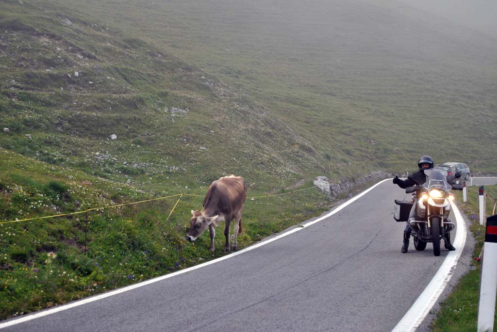 Είναι γεγονός πως η οικονομική κρίση έχει επηρεάσει αρκετά τις αποδράσεις εκτός συνόρων , η τσέπη των περισσοτέρων αναβατών δεν αντέχει συγκινήσεις ή το σκέφτεται μιας και το μέλλον είναι δύσκολο. Πάρα ταύτα μαζεύοντας ένα μικρό κομπόδεμα από τις αρχές του χρόνου για μια ολιγοήμερη εξόρμηση στο εξωτερικό αποφάσισα να επισκευθώ την γειτονική Ιταλία. Από το περσινό οδοιπορικό στην Καππαδοκία είχα γνωρίσει ένα ζευγάρι Ιταλών με τους οποίους διατήρησα φιλική σχέση όλο αυτό το χρονικό διάστημα ,ρωτώντας λοιπόν τον Λορέντζο « να έρθω;» η απάντηση ήταν άμεση και θετική! Δύο εβδομάδες μετά βρισκόμουν στην Εθνική Αθηνών Κορίνθου Πατρών με σκοπό να επιβιβαστώ στο πλοίο των Μινωικών γραμμών με λιμάνι άφιξης την Ανκόνα. Το πλάνο της εκδρομής οργανώθηκε εξ ολόκληρου από τον φίλο Ιταλό και σκοπός του ήταν να διασχίσουμε 7 passo στις Ανατολικές Ιταλικές Άλπεις με αποκορύφωμα το γνωστό σε όλους μας Passo Dello Stelvio (2758m). H Διαδρομή μέχρι την Πάτρα ήταν «κολασμένη» ο καυτός ήλιος οι εργασίες κατασκευής του νέου οδικού δικτύου , τα φορτηγά , καθιστούσαν την οδήγηση δύσκολη και κουραστική, το πλοίο ήταν η όασή μου αλλά συνάμα και εφιάλτης (20 ώρες δρομολόγιο). Από τους 39 βαθμούς της Ελλάδας έπεσα στους...35 της Ιταλίας, Παρασκευή μεσημέρι ξεκίνησα από την Ανκόνα με προορισμό την Φεράρα , μια απόσταση 237 χιλιομέτρων εκ των οποίων τα πρώτα 100 μέχρι το Ρίμινι ήταν υπό κατασκευή...αλλά δεν το καταλαβαίνεις, σωστή σήμανση ,βοηθητικές λωρίδες , αστυνόμευση , κανένα πρόβλημα , μετά το Ρίμινι συνεχίζει ο δρόμος μέχρι την Μπολόνια και από εκεί την Φεράρα με την κλασσική και καταπληκτική autostrada , 3 λωρίδες, ατελείωτες ευθείες και «αγριεμένη» άσφαλτο. Όμως η άφιξη μου στην Φεράρα ήταν στις 1830 το απόγευμα μετά από 3.5 ώρες λόγω σοβαρού ατυχήματος και ατελείωτου μποτιλιαρίσματος έξω από την Μπολόνια, μια νταλίκα είχε διπλώσει με αποτέλεσμα να χτυπήσει 2 αυτοκίνητα. Συναντήθηκα με τον Ιταλό «μαφιόζο» φίλο στην είσοδο της πόλης και αφού τακτοποιηθήκαμε ,είπαμε και δυό κουβεντούλες , βγήκαμε στους δρόμους για την απαραίτητη περιήγηση στην πόλη και φυσικά το δείπνο με την παραδοσιακή Ιταλική πίτσα. το αυτοκόλληιτο του φόρουμ ελπίζω να μην το ξεκολλήσουν.... Η Φεράρα με μάγεψε ,για την ιστορία λοιπόν βρίσκεται 50 χιλιόμετρα βορειοανατολικά της Μπολόνια και χαρακτηριστεί από την Unesco Μνημείο της παγκόσμιας πολιτιστικής κληρονομιάς. Στην πόλη ο επισκέπτης μπορεί να θαυμάσει παλάτια που χρονολογούνται από τον 14 αιώνα, το δημαρχείο της πόλης (ένα πανέμορφο παλάτι που αναπαλαιώθηκε τον 18 αιώνα) τον καθεδρικό ναό του Αγίου Γεωργίου ενώ εξακολουθεί να περιβάλλεται από περισσότερα από 9 χιλιόμετρα αρχαίων τειχών τα οποία μάλιστα είναι από τα πιο καλοδιατηρημένα τείχη της Αναγέννησης στην Ιταλία. Η παρουσία αυτοκινήτων στο κέντρο της πόλης είναι σχεδόν ανύπαρκτη , οι κάτοικοι κυκλοφορούν με ποδήλατα είτε για να πάνε στην δουλειά τους είτε για να ψώνια είτε για να διασκεδάσουν. Ιδανικά στοιχεία που δυστυχώς δεν βλέπουμε στην Αθήνα μας ,μιας και οι υπεύθυνοι μάλλον δεν γνωρίζουν το ποδήλατο, δεν γνωρίζουν πως είναι να ζεις χωρίς κίνηση και νέφος.... Το επόμενο πρωινό και μετά από μια γερή δόση εσπρέσο ( 1,00€) ξεκινήσαμε την «Βόλτα» μας στις Άλπεις. Ακολουθήσαμε την autostrada προς Πάντοβα, Βενετία Μπολζάνο και από εκεί πήραμε τον επαρχιακό οδικό άξονα με προορισμό και πρώτη στάση την πανέμορφη και γρα