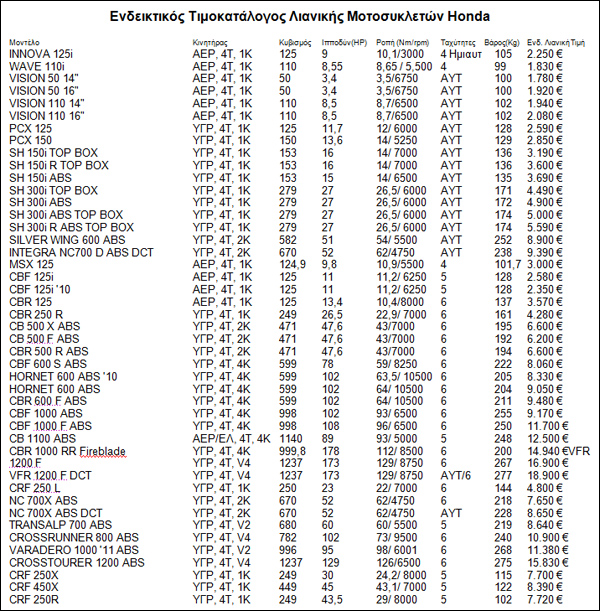 Περιλαμβάνει και τα πρωτοεμφανιζόμενα μοντέλα της εταιρείας Ανακοινώθηκε ο κατάλογος τιμών για τις μοτοσυκλέτες και τα scooter της Honda. Στη λίστα εμπεριέχονται και οι τιμές για τα νέο πρωτοεμφανιζόμενα μοντέλα της σειράς CB500 καθώς και το MSX125. Δείτε τον ενδεικτικό τιμοκατάλογο λιανικής των μοτοσυκλετών Honda... ![]() Ο τιμοκατάλογος ισχύει από τα 12-3-2013, ενώ στις τιμές δεν συμπεριλαμβάνονται τα έξοδα έκδοσης πινακίδων και τελών κυκλοφορίας. Όλες οι μοτοσυκλέτες Honda καλύπτονται με χρυσή εγγύηση δύο ετών και απεριόριστα χιλιόμετρα (εξαιρούνται οι αγωνιστικές μοτοσυκλέτες). απο το newsbeast.gr/moto/useful-videos/arthro/507427/o-neos-timokatalogos-tis-honda ![]() ![]() ![]() #artFoot {width:100%; margin:30px 0 30px 0;} #artFoot td.l {vertical-align:middle} #artFoot td.r {text-align:right;vertical-align:middle;} #artFoot td.r a {color:blue; font-weight:bold; } #artFoot td.r a:hover {text-decoration:none} #artFoot td.r img {border:0px;vertical-align:middle} #artFoot td.r table {width:100%; border-collapse:collapse; margin:0px; padding:0px } #artFoot td.r table td {vertical-align:middle;height:72px; text-align:right; color:black; font-size:14px;} #artFoot td.r table td span {font-size:12px; color:black} |