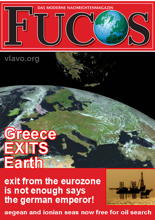 ![]() Πληθαίνουν τα δημοσιεύματα, στον γερμανικό κυρίως τύπο, που θέλουν την Ελλάδα να εγκαταλείπει όχι μόνο την Ευρωζώνη, αλλά... τον πλανήτη! Οι τελευταίες δηλώσεις φαίνεται πως έγιναν από τη Γερμανίδα αυτοκράτειρα της Ευρώπης σε μυστικό δείπνο! Ανέφερε μάλιστα σύμφωνα με έγκυρη πηγή του Vlavo Undertainment ότι τώρα με την ενοποίηση των θαλασσών, Αιγαίου και Ιονίου ανοίγει ο δρόμος για πλήρη εκμετάλλευση των κοιτασμάτων ορυκτών καυσίμων! |