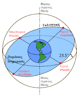 ![]() Οι ονομασίες εαρινή και φθινοπωρινή ισημερία αφορούν την εύκρατη ζώνη του βόρειου ημισφαιρίου καθώς στις αντίστοιχες ημερομηνίες στο νότιο ημισφαίριο υπάρχουν οι αντίθετες εποχές και στις δύο πολικές και την τροπική ζώνη δεν υπάρχει αυτή η διαφοροποίηση εποχών. Στην αστρονομία ισημερία καλείται η αστρική ημέρα κατά την οποία το κέντρο του ηλιακού δίσκου βρίσκεται το ίδιο χρονικό διάστημα πάνω και κάτω από τον ορίζοντα και κατά τη διάρκεια της οποίας οι ακτίνες του ηλίου πέφτουν με γωνία 90 μοιρών στον ισημερινό. ![]() Το φαινόμενο οφείλεται στην περιφορά της γης γύρω από τον ήλιο και στην κλίση του άξονα περιστροφής της. Καθώς η γη περιφέρεται γύρω από τον ήλιο και επειδή ο άξονας περιστροφής της δεν είναι κάθετος στο επίπεδο περιφοράς η διάρκεια της ημέρας αλλάζει. Δύο φορές το χρόνο η γη βρίσκεται σε τέτοια θέση που οι ακτίνες του ήλιου πέφτουν εντελώς κάθετα στον ισημερινό. Η ανατολή του ήλιου και η δύση υπολογίζονται στα διάφορα ημερολόγια σύμφωνα με τη χρονική στιγμή που θα εμφανιστεί η πρώτη ακτίνα του ήλιου και τη χρονική στιγμή που θα εξαφανιστεί και η τελευταία ακτίνα. Αυτό σημαίνει πρακτικά, σε συνδυασμό με το μέγεθος του ηλιακού δίσκου και το γεωγραφικό πλάτος που βρίσκεται κάποιος, ότι η πραγματική ίση μέρα και ίση νύχτα δεν εμφανίζεται τις ημερομηνίες που ορίζουμε ως ισημερίες. Σε πολλές γλώσσες ο αντίστοιχος όρος λεκτικά δεν αναφέρεται στην έννοια της ίσης ημέρας αλλά της ίσης νύχτας κυρίως λόγω της λατινικής προέλευσης του (λατινικά aequinoctium). Οι ισημερίες συμβαίνουν μεταξύ του χειμερινού ηλιοστασίου και θερινού ηλιοστασίου. Το φαινόμενο της ισημερίας παρουσιάζεται σε όλους τους πλανήτες κάθε ηλιακού συστήματος οι οποίοι παρουσιάζουν κλίση του άξονα περιστροφής ως προς το επίπεδο περιφοράς. Από τη Βικιπαίδεια, την ελεύθερη εγκυκλοπαίδεια