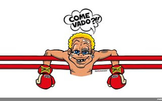 Στο κράνος εμφανίζεται ως μποξέρ που στηρίζεται στα σχοινιά, εμφανώς σακατεμένος από το ξύλο μελανιασμένος, με σπασμένο δόντι και αρκετά ζαλισμένος. Τόσο που με ένα αμήχανο ύφος και πλατύ χαμόγελο αναρωτιέται ρητορικά “Come Vado?” – «Πώς τα πάω;». «Τί πως τα πάς ρε μεγάλε» είναι η απάντηση που δεν χρειάζεται καν να δοθεί, καθώς δίνεται στην εικόνα. «Τόπι στο ξύλο έχεις γίνει»… Η σημειολογία στο σκίτσο που ανήκει φυσικά και αυτό στον Aldo Drudi, συνεχίζεται με την παράφραση της μάρκας των γαντιών που φορά. Από Everlast σε Semprelast, δημιουργώντας ένα διττό λογοπαίγνιο που «τα λέει όλα». |