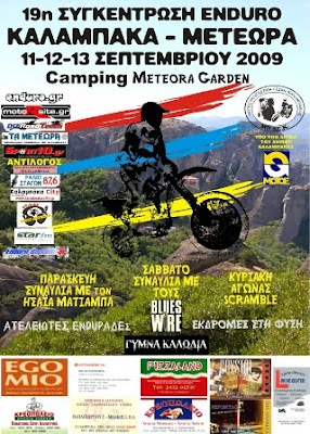 ![]() Η Μοτοσυκλετιστική Λέσχη Καλαμπάκας (ΜΟ.ΛΕ.Κ.) σας προσκαλεί στη 19η Πανελλήνια Συνάντηση Enduro που θα διεξαχθεί στην Καλαμπάκα Camping Meteora Garden, στο 2ο χλμ. της Ε.Ο. Καλαμπάκας Ιωαννίνων, το τριήμερο 11-12 και 13 Σεπτεμβρίου 2009. http://www.molek.gr ..............