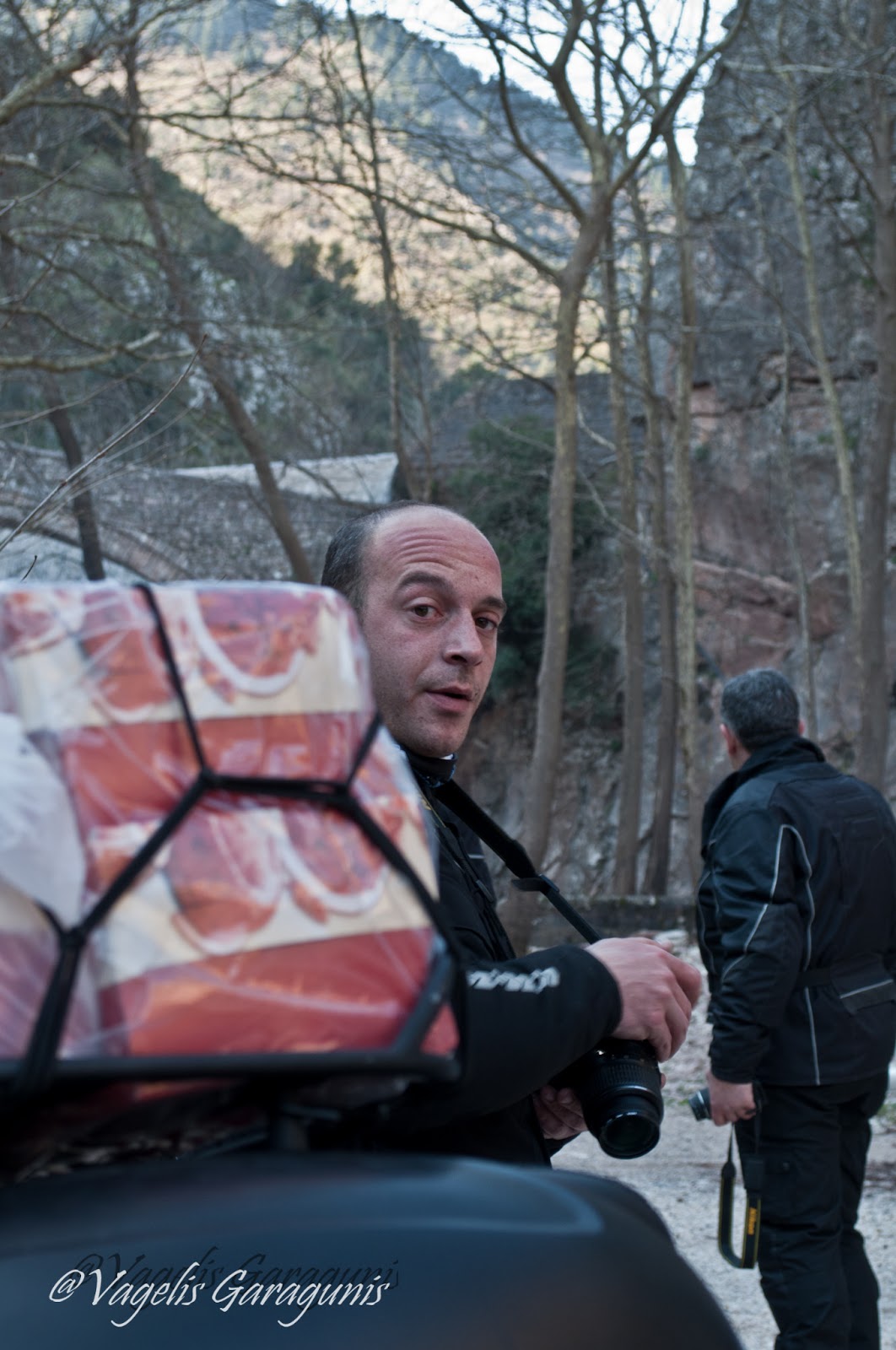 Το Κυριακάτικο ραντεβού στο γνωστό πλέον σημείο. Η ώρα πλησίαζε, όλα έτοιμα, βγαίνω από το σπίτι μου, κλειδί στην μίζα...ωπ η γριούλα μου αρνείται να ανταποκριθεί...πριν 2 ημέρες είχε τελειώσει η νοσηλεία της. Όλα οκ μου λέει ο μάστορης. Αμ, δε...το γνωστό πρόβλημα με την απώλεια ρεύματος παρέμενε... Τηλέφωνο στον Αποστόλη. Σε 10 λεπτά το Caponord βρισκόταν εκεί και ο Αποστόλης ανέλαβε υπηρεσία. Σπρώξιμο μια..τίποτα, δεύτερη τίποτα...φίδια παντού..άλλη μια του λέω...τρίτη και ο κινητήρας από το μωρό μου άρχισε να ξεροβήχει και στη συνέχεια το γνωστό γουργουρητό. Πρόβλημα με το καλημέρα σας, δε βαριέσαι, πάμε και βλέπουμε... 8 και κάτι και η παρέα συγκεντρωμένη και έτοιμη για αναχώρηση. Χαμόγελα και πειράγματα έδιναν το στίγμα για αυτά που θα ακολουθούσαν. (φωτογραφία Φώτη) Το πρώτο κομμάτι της διαδρομής και η πρώτη στάση θα γινόταν στους καταρράκτες της Παλαιοκαριάς, λίγα χιλιόμετρα (32) από τα Τρίκαλα. Λίγες φωτογραφίες από την περιοχή και κάποιες πληροφορίες. Είναι από τα αγαπημένα μου μέρη. Πολύ κοντά μου και πανέμορφα. Ιδανικό μέρος και για να στήσετε τη σκηνή σας (αν και την άνοιξη ο θόρυβος από τα νερά του καταρράκτη είναι εκκοφαντικός). Πολύ κοντά υπάρχουν αρκετά χωριά με μεγαλύτερο αυτό της Πύλης όπου και μπορείτε να προμηθευτείτε ότι χρειάζεστε. Αν συνεχίσετε τον δρόμο προς Παλαιοκαριά συναντάτε τα σκαλάκια που σας κατεβάζουν πάνω στην τοξοτή γέφυρα. Μια επίσκεψη στο καφενεδάκι του μπαρμπα Στέφανου θεωρείται επιβεβλημένη (βρίσκεται στην Άνω Παλαιοκαριά) Ο Γιάννης κουβάλαγε κάτι κουτιά στο top-case. Δεμένα επιμελώς. Κάτι μας ετοιμάζει αυτός.... Ο Βασίλης και ένα από τα ομορφότερα KTM 990 που έχω δει. Καλός φίλος, ήρθε από την Αθήνα για την βόλτα. Ευχαριστώ για την τιμή Βασίλη. Όλα για την τέχνη :P ![]() (Φωτογραφία John The Son) |