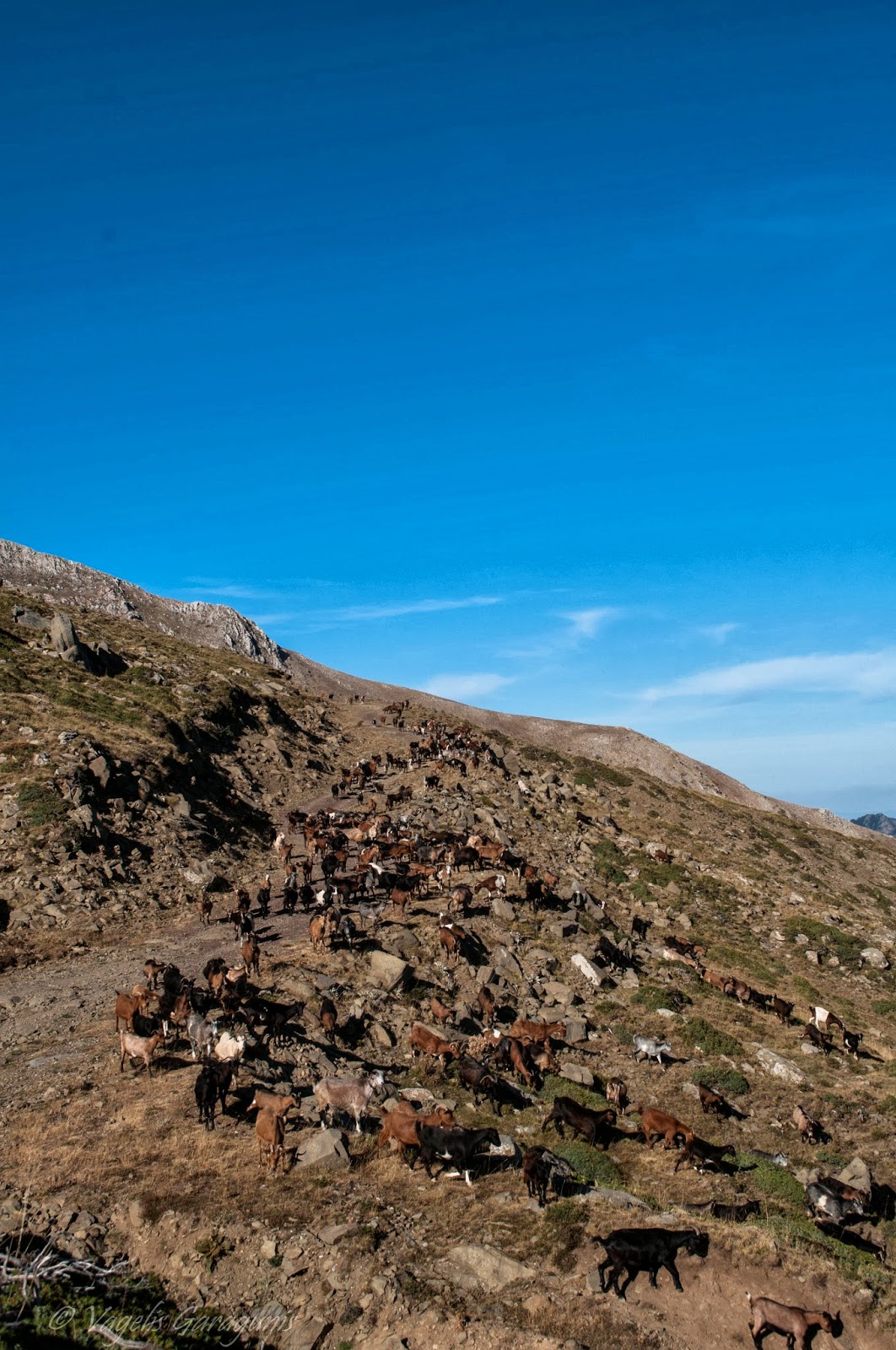 Είχε έρθει η ώρα να συνεχίσουμε και αφού είχαν απομακρυνθεί όλα τα ζώα από κοντά μας, ευχαριστήσαμε τον άνθρωπο για την υπομονή του να κατεβάσει τα ζώα χωρίς καν να μας γαυγίσουν τα σκυλιά του. Όσο ανεβαίναμε ο δρόμος γινόταν και πιο δύσκολος. Η οδήγηση απαιτητική και το ρεζερβουάρ μου στα τελειώματα....