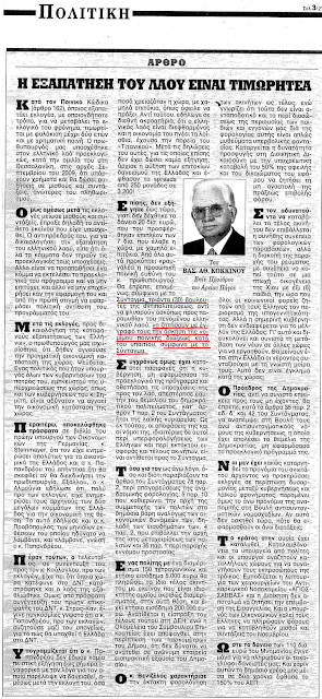 ΖΕΙΔΩΡΟΝ: Ο π. πρόεδρος του Αρείου Πάγου Β. Κόκκινος προτείνει την ποινική δίωξη του πρωθυπουργού...!!! «ΣΥΜΦΩΝΑ ΜΕ ΤΟ ΣΥΝΤΑΓΜΑ ΑΡΚΟΥΝ ΜΟΝΟ... 30 ΒΟΥΛΕΥΤΕΣ ΓΙΑ ΝΑ ΖΗΤΗΣΟΥΝ ΤΗΝ ΑΣΚΗΣΗ ΤΗΣ ΠΟΙΝΙΚΗΣ ΔΙΩΞΗΣ ΤΟΥ...!!! Bαρυσήμαντο άρθρο του Β. Κόκκινου π. Προέδρου του Αρείου Πάγου στην εφημερίδα "Αξία". Αφού περιγράφει και εξηγεί τις ευθύνες του Πρωθυπουργού γιά την οικονομική κρίση, με κομβικό σημείο ότι μας οδήγησε προμελετημένα στην μέγγενη του Δ.Ν.Τ., δεδομένου ότι «εκτός των άλλων» αρνήθηκε και το δάνειο Πούτιν 20 δις ευρώ, με την αδιαμφισβήτητη νομική του κατάρτιση παραπέμπει σε διατάξεις του Ποινικού Κώδικα και άρθρων του... Συντάγματος πού στοιχειοθετούν το αδίκημα της Εξαπάτησης του Ελληνικού Λαού. Για δε την παραπομπή του δεν απαιτείται τίποτα παραπάνω από 30 υπογραφές Βουλευτών πού μπορούν να ζητήσουν την άσκηση... ποινικής δίωξης ...!!! Είναι πολύ ενδιαφέρον και κάνοντας κλικ επάνω στην φωτό έχετε την άνεση να το διαβάσετε... |