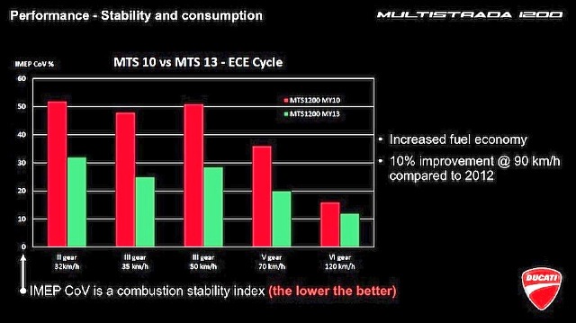 Παρασκευή, 12 Οκτωβρίου 2012, 12:52 ![]() Στη συνέχεια της παρουσίασης των αναβαθμίσεων στις αναρτήσεις του Ducati Multistrada 2013, θα αναφερθούμε στις βελτιώσεις του κινητήρα. Οι βελτιώσεις αυτές αντιπροσωπεύουν βαθύτερες αλλαγές στη φιλοσοφία σχεδίασης του κινητήρα από πλευράς των ιταλών μηχανικών. Ο δικύλινδρος V-90 του Multistrada είναι ο γνωστός «Testastretta 11°» τον οποίο φορά το μοντέλο από την παρουσίασή του το 2010. Testastretta σημαίνει «στενή κεφαλή» και η συγκεκριμένη σχεδίαση χρονολογείται από το 2001 οπότε και φορέθηκε αρχικά στο 996R. Το επίθετο «στενή» δεν προσδιορίζει το πλάτος της κεφαλής σε εκατοστά, αλλά το ότι διαθέτει μικρή περιεχόμενη γωνία βαλβίδων. Οι προηγούμενες κεφαλές στα Ducati είχαν περιεχόμενη γωνία βαλβίδων 40 μοίρες. Στην Testastretta είναι μόλις 25ο. ![]() Αφού ξεκαθαρίσαμε την έννοια αυτή, ας δούμε τι σημαίνει τώρα το «11ο»... Είναι λίγο περίπλοκο, αλλά για αρχή, σημαίνει 11 μοίρες. Ο αριθμός «11» λοιπόν αναφέρεται στο διάστημα overlap (μετριέται σε μοίρες) του στροφάλου. Εννοώντας ότι για 11 μοίρες περιστροφής του στροφάλου, παραμένουν ταυτόχρονα ανοιχτές τόσο οι βαλβίδες εισαγωγής όσο και εξαγωγής. Λίγη βασική τεχνογνωσία: Όσο μεγαλύτερο το διάστημα overlap (αλληλοκάλυψης), τόσο μεγαλύτερη η κατανάλωση και η απόδοση του κινητήρα στις υψηλές στροφές, αλλά και τόσο χειρότερες η ροπή, η ομαλή λειτουργία και οι εκπομπές ρύπων στις λίγες στροφές. Αντίθετα όταν το overlap είναι περιορισμένο (λίγες μοίρες), τόσο πιο ήμερος, γραμμικός και νηφάλιος είναι ο κινητήρας, με ανάλογα μικρότερη κατανάλωση αλλά και απόδοση. Στην 1198 από την οποία προέρχεται ο παρών κινητήρας, το overlap είναι 40 μοίρες. Στο Multistrada μόλις 11. Σαφώς λοιπόν έχει δοθεί βάρος από τους σχεδιαστές στην ευκολία οδήγησης, τη πολιτισμένη συμπεριφορά, τη μείωση των κραδασμών, της κατανάλωσης και των εκπομπών ρύπων. ![]() Μετά τη βασική αυτή εισαγωγή, ας δούμε τι αλλαγές κουβαλάει ο νέος Testastretta: Τα μπεκ ψεκασμού ψεκάζουν τώρα το καύσιμο υπό οξύτερη (μικρότερη) γωνία στον αυλό εισαγωγής, ουσιαστικά πάνω στη «ράχη» της αντίστοιχης βαλβίδας. Σκοπός είναι η ταχύτερη εξαέρωσή του, διότι αυτό βελτιώνει την καύση και άρα την αποδοτικότητά του. Κανονικά το καύσιμο βγαίνει από τις οπές του μπεκ υπό τη μορφή μικροσταγονιδίων, τα οποία καίγονται λιγότερο αποτελεσματικά από ό,τι το ίδιο καύσιμο σε αέρια μορφή. Η τροποποίηση αυτή υπονοεί και αλλαγή της σχεδιαστικής φιλοσοφίας, καθώς στο προηγούμενο μοντέλο το μπεκ ψέκαζε σχεδόν κάθετα στον αυλό εισαγωγής, προκειμένου να επιτευχθεί ομοιόμορφη διάχυση του καυσίμου στο παρεχόμενο ρεύμα αέρα. Η φετινή τροποποίηση σημαίνει ότι πλέον θεωρείται προτιμότερη η ταχεία εξαέρωση του καυσίμου, με το πρόσθετο πλεονέκτημα της ψύξης της βαλβίδας εισαγωγής (το πλέον καταπονούμενο μέρος ενός σύγχρονου κινητήρα μετά το έμβολο). ![]() Επιπλέον η Ducati πρόσθεσε ένα δεύτερο μπουζί σε κάθε κύλινδρο. Ο σπινθήρας του δημιουργεί ένα δεύτερο μέτωπο φλόγας, με αποτέλεσμα να είναι συντομότερη η καύση του μείγματος, επιτρέποντας την αλλαγή του χρονισμού του κινητήρα. Αυτή η πρακτική μειώνει τις αυξομειώσεις της πίεσης μέσα στον κύλινδρο και άρα την καταπόνησή του. Αυτό με τη σειρά του βελτιώνει την ομαλή λειτουργία του κινητήρα, ενώ για τον ίδιο λόγο έχει προστεθεί και ένα δεύτερο σύστημα ψεκασμού που παροχετεύει ατμοσφαιρικό αέρα απευθείας στην εξαγωγή, πίσω από τις αντίστοιχες βαλβίδες. Στο σημείο αυτό η θερ