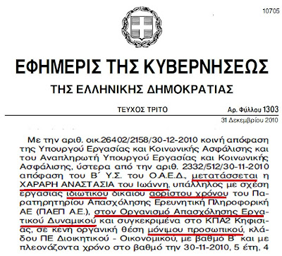 μετατάχθηκε στον ΟΑΕΔ, σε θέση "μόνιμου προσωπικού κλάδου ΠΕ Διοικητικού-Οικονομικού"